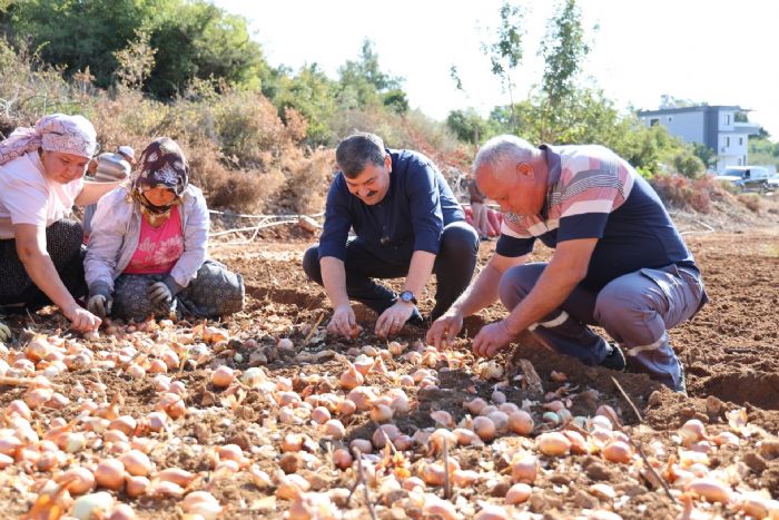 Tarlada soğan eken kadın çiftçilere başkandan sürpriz ziyaret