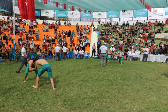 Er meydanında, başpehlivanlık güreşi öncesi Türk bayrağı açıldı. Başkan Yılmaz, sporculara malzeme hediye ederek, başarılarının devamını diledi.