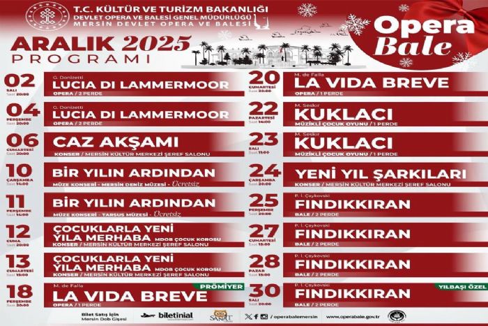 Mersin Devlet Opera ve Balesi (MDOB), Aralık ayı boyunca sahneleyeceği üç özel etkinlikle büyük bir ilgi gördü. Sezonun en çok talep gören programları arasında yer alan ‘Fındıkkıran’ balesi, ‘Caz Akşamı’ konseri ve ‘Yeni Yıl Şarkıları’ konseri için tüm biletler tükenmiştir. Sanatseverlerin yoğun ilgisi, MDOB’un Aralık ayını kapalı gişe bir sanat şölenine dönüştürmesine olanak sağladı.